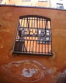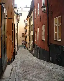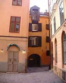 The oldest archaeological traces underlying the area are the remains of a landing stage found close to today's Österlånggatan, revealing that it was first settled in the late-13th and early-14th centuries. The oldest historical evidence mentions two stone houses on Österlånggatan flanking an alley leading down to a bulwark by the water demolished in 1430. The location of the bulwark can still be seen at the border between the properties south of the alley.[3]