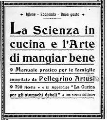 His manual, however, entitled La scienza in cucina e l'arte di mangiar bene, was much more successful. In 1891, at age 71, he completed his cookbook, but could not find a publisher. So he used his own money to self-publish, selling a thousand copies of the first edition in four years.[3] Soon, however, the cookbook caught on, and before Artusi died, more than 200,000 copies had been sold. Filled with amusing anecdotes as well as recipes, the book is a perennial best seller in Italy, and has been translated into Spanish, French, Dutch, German, English and, most recently, Portuguese and Polish.