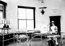 The hospital's board of directors debated potential uses of the funds, and on 7 October 1895 settled on building an operating room favoured by Davie.[3] It would implement the anti-sepsis techniques developed by Joseph Lister,[1] which Davie had studied during a sabbatical in Europe in the 1880s.[4][3] The winning design, "Plan 3" by John Teague, was selected on 20 March 1896, and the winning tender for its construction was submitted by Thomas Catterall for $3,614.[5] Teresa Pemberton donated the additional $114.[5]