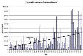 Water flow rates in the Pembina River watershed are highly variable. Data from hydrometric stations are used to monitor river flow rates and lake levels, for flood forecasting, and water management investigations. Water levels typically peak during spring run-off and rapidly declines generally in a few days. Groundwater contribution to stream flow normally ensures the river runs throughout the year. The months of March, April and May account for 68 percent of the run-off in a given year. Annual spring run-off rates are highly variable. In Neche, ND the lowest annual volume recorded was 356-m (2870 acre-ft) in 1939. The highest recorded volume was 94,400 hectare-m (765,000 acre-ft) in 1997.[5]
