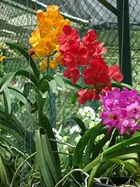 The path around the Lily Pond offers access to tropical rainforest, a short distance from the Botanic Gardens gate. The walk from the Lower Circular Road passes two prominent groups of palms and bamboo clusters along the Waterfall River. Two orchid houses provide a comparison between cultivated hybrids and wild orchid species. The best time to admire the flowering trees is during the dry season, from February to April, when the Thai bungor (Lagerstroemia loudonii), the Javanese cassia (Cassia javanica) and the rosy trumpet (Tabebuia rosea) are in full flower.[10]