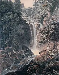 Under Curtis three "Experimental Gardens" were established, including the "Waterfall Nursery Gardens" (580 m) that was developed into the present Botanic Gardens, the "Top Hill Nursery" (777 m) later renamed the "Government Bungalow Garden", and the "Plains Nursery" later comprising the Government Residency.[7] Located at 579 m, with an average annual rainfall in the 1890s of 381 cm, the site of the Botanic Gardens embraces over 29 ha, comprising a significant middle portion, of the Waterfall River valley below the Waterfall which cascades from a height of over 120 m. The heavy rainfall often resulted in management problems, and land slips in the "steepest part of the grounds".[7] The third Botanic Gardens were eventually sited in the Waterfall River valley on land acquired by the colonial government in 1884–85 for this purpose. Curtis records that much of this land was owned by a Mr Hogan.[7]