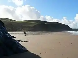 Traeth Penbryn is a popular 1+1⁄2 miles (2.4 km) long sandy beach with a car park. It is owned by the National Trust, and was a location in the James Bond film Die Another Day. There are several caves at the north end of the beach and at low tide a further large sandy bay can be accessed along the beach to the north and Tresaith can be reached to the west.[12] Penbryn lies on the Ceredigion Coast Path with steep routes along the cliff tops.[13]