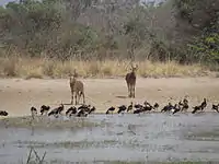 Pendjari National Park has a relatively large population of elephants, which was stable over the last decades and counted more than 800 individuals between 2005 and 2010.[1] The WAP Complex's elephant population is more than 3,800, making it the largest elephant concentration in all of western Africa.[2] The second largest species of the park is the hippopotamus. There are also large populations of several other large herbivores like African buffalo (Syncerus caffer brachyceros; c. 2,700 animals in 2000), western hartebeests (Alcelaphus buselaphus major; c. 1,500 in 2000), roan antelope (c. 2,000 in 2000), kob antelope (c. 2,600 in 2000), and warthogs. Some other antelope species like korrigum (Damaliscus lunatus korrigum), bushbuck, and reedbuck are relatively rare. Smaller bovids are the red-flanked duiker, oribi, and common duiker. Primates are represented by the olive baboon, patas monkey, and tantalus monkey.[3]
