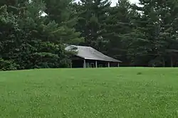 Pendle Hill is located on the crest of a low ridge paralleling both US 202 and the southeastern shore of China Lake, north of the village of South China. The house itself is set on the edge of a small wooded area, with a view down the west side of the ridge toward the lake, across a cleared meadow. The meadow is separated from the lake by a wooded area. The house is a modest 1+1⁄2-story Shingle style structure, with a gable roof that changes pitch to extend on the west side over a porch, with shingled square posts for support. The interior is finished in stained pine, and is modestly styled, with exposed roof trusses.[2]