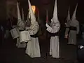 The habit of the brotherhood and its long caperuz, are white serge, to which is added a sash and purple edges. The brothers wear Franciscan sandals, carrying a black wood torch, with metal bowl and a red wax candle.[2][3]