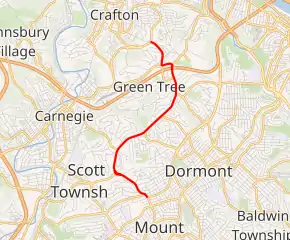 PA 121 begins at an intersection with US 19 in the township of Mt. Lebanon, heading northwest on Cochran Road, a two-lane undivided road that heads through residential areas. From the southern terminus, the route is concurrent with the Yellow Belt of the Pittsburgh/Allegheny County Belt System. The road widens to four lanes as it enters commercial areas and becomes the border between Mt. Lebanon to the southwest and Scott Township to the northeast. PA 121 splits from the Yellow Belt and Cochran Road by turning north onto four-lane Greentree Road, fully entering Scott Township. The road passes through residential and commercial areas as it turns to the northeast, narrowing to two lanes as it enters the borough of Green Tree. In this area, the route passes more homes, with the Blue Belt joining the road at the Potomac Avenue intersection. PA 121 curves to the north, becoming a three lane road with a reversible lane. The road enters commercial areas, widening to four lanes as it reaches an interchange with I-376/US 22/US 30. Immediately after this interchange, PA 121 turns west onto Mansfield Avenue, a three lane road with one northbound lane and two southbound lanes. The route turns north onto two-lane Poplar Street and heads into wooded areas of homes. PA 121 heads northwest to reach its northern terminus at PA 50 on the border of Green Tree and the city of Pittsburgh in commercial areas.[2][3]