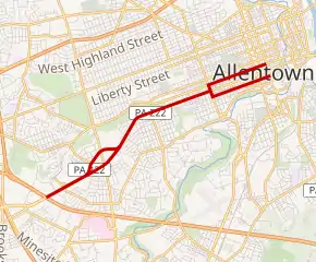 Pennsylvania Route 222 (PA 222) is a 4.482 mi (7.213 km)-long state highway located in Allentown and its immediate suburbs in the Lehigh Valley region in eastern Pennsylvania.