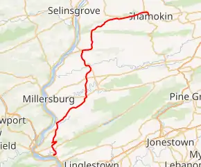 Pennsylvania Route 225 (PA 225) is a 48.5-mile-long (78.1 km) state highway located in Dauphin and Northumberland Counties in Pennsylvania. The southern terminus is at an interchange with U.S. Route 22 (US 22)/US 322 in Dauphin. The northern terminus is at PA 61 in Shamokin. PA 225 is mostly a two-lane undivided road running through mountain and valley areas in the central part of the state. The route serves the communities of Halifax, Elizabethville, Berrysburg, Pillow, and Trevorton. PA 225 intersects PA 325 north of Dauphin, PA 147 in Halifax, US 209 in Elizabethville, PA 25 in Berrysburg, and PA 890 in Trevorton.