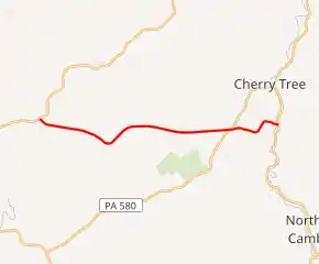 PA 240 begins at an intersection with PA 286 in Green Township, Indiana County, heading southeast on a two-lane undivided road. The route heads through wooded areas and crosses a R.J. Corman Railroad line, curving east into a mix of farmland and woodland with some homes. The road heads through open farmland and turns southeast, passing through the residential community of Cookport. PA 240 turns northeast into more rural areas of farms and woods with some residences, heading east again. Farther east, the route comes to an intersection with PA 580 in the community of Uniontown. Past this intersection, the road heads into wooded areas with some homes.[2][3] The route enters Susquehanna Township in Cambria County and becomes Peg Run Road, turning northeast and east through more forested areas of residences. PA 240 crosses the West Branch Susquehanna River and comes to its eastern terminus at an intersection with US 219.[2][4]