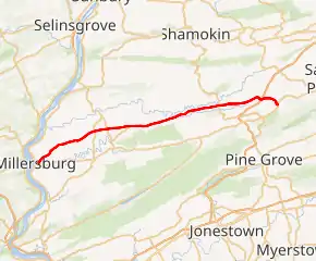 PA 25 begins at an intersection with US 209 in the borough of Millersburg in Dauphin County, heading northeast on two-lane undivided Johnson Street. The road passes homes and continues into Upper Paxton Township, becoming Berrysburg Road and heading into open agricultural areas with a few residences in the Lykens Valley, a rural valley that is home to an Amish community.[2][3][4] The route runs through Killinger and continues through more rural areas, curving more to the east. PA 25 crosses into Mifflin Township and becomes an unnamed road, passing through Curtin and heading to the northeast. The road enters the borough of Berrysburg and becomes West Market Street, passing homes and coming to an intersection with PA 225. At this point, the route becomes East Market Street and runs past more residences before heading back into Mifflin Township and becoming an unnamed road that passes through open farmland. PA 25 continues into Lykens Township and runs through more rural areas with occasional homes. The road becomes the border between Lykens Township to the north and the borough of Gratz to the south as it becomes West Market Street and passes through agricultural areas with residential and commercial development, fully entering Gratz. The route continues past more homes along with some businesses, becoming a divided highway as it passes through the center of town and becomes East Market Street. PA 25 becomes an undivided road again and leaves the developed part of town for farmland with some homes and businesses. The road heads into Lykens Township again and becomes unnamed as it runs through agricultural areas with occasional woods and residences.[2][3]