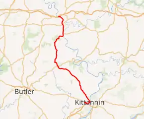 The route has, for the most part, stayed on the same roads for its entire existence, with the exception of the southern terminus. The original southern terminus was in the town of West Kittanning with US 422 when that route passed through the town.[2] When the Kittanning bypass was built, the terminus was moved to its current location.