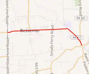 Pennsylvania Route 317 (PA 317, also designated by the Pennsylvania Department of Transportation as SR 317) is a 4.8-mile-long (7.7 km) state highway located in Lawrence County, Pennsylvania. The western terminus is at the Ohio state line near Bessemer, where it continues westward as Ohio State Route 630 (SR 630). The eastern terminus of PA 317 is at the junction of PA 108 and PA 551 in Mount Jackson, a portion of North Beaver Township.