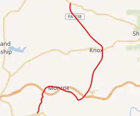 PA 338 begins at an intersection with PA 58 in the community of Alum Rock in Richland Township, heading north on a two-lane undivided road. The route heads through wooded areas and passes through the residential community of Turkey City. North of here, the road passes under I-80 before curving to the east and running through agricultural areas with some homes, heading into Beaver Township and passing through Monroe. PA 338 crosses over I-80 again and runs near more farmland before turning southeast through a woodland area. After passing through the residential community of Blairs Corners, the route curves northeast and passes under I-80 again. After this, the road passes through more woodland before continuing into agricultural areas. PA 338 heads north-northeast through a mix of farmland and woodland with some residences, crossing into the borough of Knox. At this point, the route becomes Main Street and runs past homes, intersecting PA 208. Following this intersection, the road curves northwest and crosses back into Beaver Township, running through more areas of farms and woods with occasional residences as an unnamed road. PA 338 enters Ashland Township and continues northwest through more rural areas, turning to the north before ending at US 322 in Kossuth.[2][3]