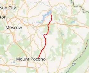 When Pennsylvania first legislated routes in 1911, what is now PA 390 was not given a route number.[5] PA 390 was designated in 1928 to run from PA 90 (now PA 191) in Mountainhome north to PA 90/PA 507 in Newfoundland, following its current alignment between Mountainhome and Canadensis before it turned northwest to Newfoundland. At this time, the section between Mountainhome and Canadensis was paved while the remainder of the road was unpaved. The present alignment of PA 390 south of Mountainhome was a paved road that was designated as part of PA 90.[6] By 1930, the highway between Canadensis and Lake Wallenpaupack was an unnumbered road that was paved in Monroe County and unpaved in Pike County.[7] In the 1930s, PA 390 was rerouted at Canadensis to head north to PA 507 on the shore of Lake Wallenpaupack north of Tafton. At this time, the entire road north of Canadensis was paved except for a portion near Promised Land State Park. The former alignment of PA 390 between Canadensis and Newfoundland became a northern extension of PA 290 (now PA 447).[8] The unpaved section of PA 390 in Pike County was paved during the 1940s. In addition, PA 90 was shifted east to a new direct alignment between Paradise Valley and Cresco, leaving the former section unnumbered.[9] PA 390 was extended south from Mountainhome to its current southern terminus at PA 940 west of Paradise Valley in the 1970s, running concurrent with PA 191 between Cresco and Mountainhome.[10]