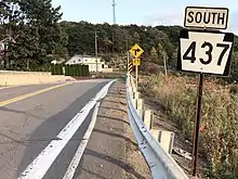 Pennsylvania Route 437 Truck is a truck route of PA 437 that bypasses a weight-restricted bridge over a tributary of Creasy Creek in Dennison Township, on which trucks over 28 tons and combination loads over 34 tons are prohibited. The route follows PA 940, I-80, and PA 309.[7] It was signed in 2013.[8] The bridge was completely reconstructed in 2017, and PennDOT removed all PA 437 Truck signs from the roads it followed.[9]