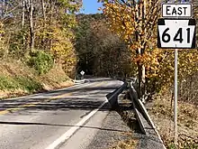 Pennsylvania Route 641 Truck (PA 641 Truck) is an 8.4-mile-long (13.5 km) truck route of PA 641 in Fannett Township in Franklin County that bypasses a winding section of PA 641 that crosses Kittatinny Mountain. PA 641 Truck begins at PA 641 by heading east-southeast on two-lane undivided Amberson Road, which is designated as State Route 4006 (SR 4006). The road soon turns to the northeast and runs through a mix of farmland and woodland, with the Pennsylvania Turnpike (I-76) parallel to the northwest. The truck route heads through the community of Laurel Grove before it passes under the Pennsylvania Turnpike. PA 641 Truck curves to the east and runs through farmland before it turns southeast onto Cold Spring Road, still following SR 4006. The road curves to the south as it comes to a bridge over the Pennsylvania Turnpike just west of the Kittatinny Mountain Tunnel. The truck route heads southwest through forested areas as it traverses Kittatinny Mountain. PA 641 Truck reaches its eastern terminus at another intersection with PA 641 between Kittatinny and Blue mountains.[4][13]