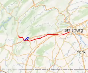 Pennsylvania Route 641 (PA 641) is a state route located in Central Pennsylvania in the United States. The route is 57.9 miles (93.2 km) long and runs from U.S. Route 522 (US 522) near Shade Gap east to US 11/US 15 in Camp Hill. PA 641 heads east from Shade Gap in Huntingdon County and immediately crosses PA 35 before it heads across Tuscarora Mountain into Franklin County. The route intersects PA 75 in Spring Run before it crosses Kittatinny and Blue mountains and reaches a junction with PA 997 in Roxbury. PA 641 heads into the agricultural Cumberland Valley and enters Cumberland County, where it intersects PA 696 in Newburg and PA 233 in Newville before reaching Carlisle. In Carlisle, the route runs concurrent with US 11 and PA 74 on High Street and crosses PA 34 in the center of town. East of here, PA 641 has an interchange with Interstate 81 (I-81) and heads to Mechanicsburg, where it intersects PA 114. The route continues through the western suburbs of Harrisburg and has an interchange with US 11/PA 581 before ending in Camp Hill. PA 641 has a truck route, PA 641 Truck, that bypasses the winding stretch across Kittatinny Mountain.