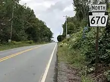 Pennsylvania Route 670 (PA 670) is a 21.26-mile-long (34.21 km) state highway located in Wayne County, Pennsylvania. The southern terminus is at PA 191 in Honesdale. The northern terminus is at PA 370 in Preston Township. The route is a two-lane undivided road that runs through rural areas in the northern part of Wayne County. PA 670 heads northwest from PA 191 and passes through Bethany. Farther northwest, the route crosses PA 247 and intersects the northern terminus of PA 170 before turning west to run concurrent with PA 371 in Pleasant Mount. PA 670 turns north from PA 371 and continues to its end at PA 370 in Orson.