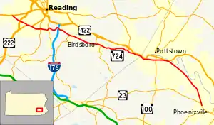 Pennsylvania Route 724 (PA 724) is a 30-mile (48 km) road in the U.S. commonwealth of Pennsylvania that runs from U.S. Route 422 (US 422) in Sinking Spring southeast to PA 23 near Phoenixville. PA 724 travels through Berks and Chester counties. The route runs through the southern suburbs of Reading, passing through Shillington and Kenhorst. Past the Reading area, PA 724 continues southeast parallel to the Schuylkill River, passing through or near Birdsboro, Pottstown, and Spring City. The route intersects many roads including US 222 near Shillington, PA 10 and Interstate 176 (I-176) southeast of Reading, PA 345 in Birdsboro, and PA 100 and US 422 near Pottstown.