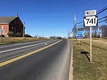 When Pennsylvania first legislated routes in 1911, present-day PA 741 was not given a route number.[6] US 230 was designated onto the road between Willow Street and Lampeter in 1926; PA 72 was designated concurrent in 1927 and the US 230 designation was replaced by US 222 in 1928.[7][8][9] In 1928, the road between Willow Street and Gap was designated as part of PA 41, which ran from Harrisburg southeast to the Delaware border. At this time, the road was paved between Willow Street and Strasburg and unpaved between Strasburg and Gap.[9] By 1930, PA 741 was designated to run PA 41 north to US 30 in Gap on a paved road. By this time, PA 41 was paved from a point east of Strasburg east to Gap. Also, the concurrent PA 72 designation was removed from US 222/PA 41 between Willow Street and Lampeter.[10] In the 1930s, PA 741 was realigned to run from US 222 in Lampeter east to PA 41 in Gap, replacing that section of PA 41. Meanwhile, PA 41 was realigned onto the former alignment of PA 741 heading north to US 30 in Gap.[11] By 1950, the current alignment of the route between East Petersburg and Willow Street was paved; at this time the road did not carry a route number.[12] In the 1970s, PA 741 was extended west to PA 324 south of New Danville.[13] The route was further extended north to PA 722 in East Petersburg in the 1980s, following its current alignment and Rohrerstown Road to East Petersburg before following Lemon Street to PA 722.[14] PA 741 previously ran concurrent with PA 896 between Decatur Street and Georgetown Road in Strasburg.[15] The concurrency was removed when PA 896 was rerouted to bypass Strasburg to the northeast in November 2009.[16] After 2005, the western terminus of PA 741 was cut back from PA 722 in East Petersburg to its current location north of the Commercial Avenue intersection in East Hempfield Township.[3][15]