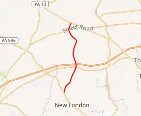 When Pennsylvania first legislated routes in 1911, present-day PA 796 was not legislated as part of any route.[4] By 1928, the current route of PA 796 was paved between the southern terminus and north of Jennersville; at this time it did not carry a route number.[5] By 1930, PA 796 was designated to run from the Maryland border southeast of Kemblesville north to a point north of Jennersville, heading through Kemblesville and New London before picking up its current alignment.[6] In 1937, the southern terminus was cut back to its current location, with an extended PA 896 replacing the route south of that point.[7][8] By 1940, the northern terminus was extended to PA 926 along a newly-paved road.[8] The route was extended north to PA 41 along a paved road during the 1940s.[9] By 1970, the interchange with the US 1 freeway was built, with the route having previously intersected US 1 at the Baltimore Pike intersection.[10][11]