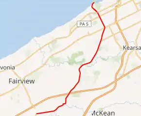 When Pennsylvania first legislated routes in 1911, what is now PA 832 was not given a number.[4] PA 832 was formed in 1928, stretching from PA 99 (now PA 5 Alt.) to Presque Isle.[5][6] By 1940, the southern terminus of the route was at US 20 west of Erie.[7][8] In 1959, PA 832 was extended from US 20 to the new I-90 (the Erie Throughway) in order to provide access to Erie and Presque Isle for motorists coming from the west and also to serve the western suburbs of Erie.[9][10] By 1970, the southern terminus was moved to its current location at PA 98.[11]