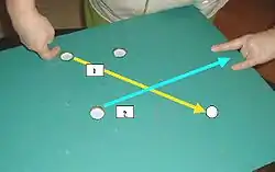The object of the game is to flick a coin through the other two coins. This is the way in which players move the ball up the table. If the coin falls off the table or fails to pass through the other two coins, it becomes the opposing player's ball and is placed near their end of the table. A player may continue to flick any of the three coins through the other two until they wish to shoot. At this point, the opposing player places their pinky finger and index finger flat on the table, so that the middle two knuckles of their hand are flat with the table edge. The first player then shoots in any way they wish, while still hitting a coin between the other two coins. If the coin touches the opponent's knuckles, this counts as a goal.