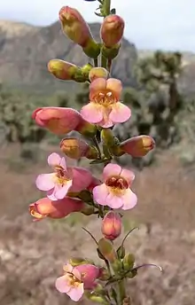 Penstemon bicolor is a species of penstemon known by the common name pinto beardtongue. It is native to the desert mountains and valleys of southern Nevada, eastern California, and western Arizona, where it grows in scrub, woodland, and other local habitat. It is a perennial herb which may exceed one meter in maximum height. The thick, serrated leaves are oppositely arranged and some pairs are fused around the stem at the bases. The inflorescence produces tubular flowers around 2 to nearly 3 centimeters long in many shades of yellow and pink, usually with striping in the throats. The flower's throat is hairy and the staminode just inside is coated in long yellowish hairs.