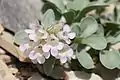 The plant is small and low to the ground. It has small green leaves and pale light-lavender flowers. It grows in steep slopes on shale, where little vegetation grows. The area is very arid and has sparse vegetation, containing sages, grasses and bushes.