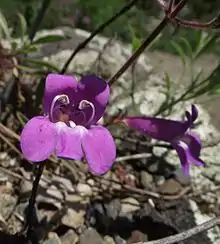Penstemon laetus is a species of penstemon known by the common names mountain blue penstemon and gay penstemon. It is native to the inland mountains of Oregon and California, where its distribution extends from the Klamath Mountains through the Sierra Nevada to the Transverse Ranges. It grows in forest, scrub, and other local mountain habitat. It is a perennial herb growing erect to about 75 centimeters tall, its base becoming woody. The leaves are linear to lance-shaped and up to 10 centimeters long. The glandular inflorescence bears blue or purple flowers up to 3.5 centimeters long. The wide-mouthed tubular or funnel-shaped flower is glandular on the outer surface and mostly hairless on the inside.