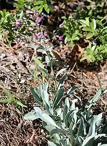 Penstemon patens is a species of penstemon known by the common name Lone Pine beardtongue. It is native to the central Sierra Nevada of California and slopes and plateau to the east, its distribution extending just into Nevada. It grows in forest, woodland, and scrub habitat types. It is a perennial herb producing hairless, waxy stems up to about 40 centimeters tall. The thick, lance-shaped, gray-green, opposite leaves are up to 9 centimeters long and 2 wide. There are usually many leaves clustered around the base of the plant and smaller pairs higher on the stem. The inflorescence bears wide-mouthed tubular flowers up to 2 centimeters long with corollas in shades of lavender to magenta. The flower is mostly hairless except for the staminode which may have a coat of orange or yellowish hairs.