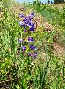 The Blue Mountain penstemon is a medium-sized perennial flower that grows 8 to 24 inches tall.[3] It usually grows with clumps of basal leaves that are narrow, oblong and 3 to 10 inches long. Stem leaves clasping with the largest ones midstem and are oval-shaped with pointed tips. Flowers are a well-spaced cluster that grows tighter towards the top. The flowers are blue or purple and are 1 to 1+1⁄2 inches long, with a short-haired staminode at the throat, and sparse hairy anthers inside.