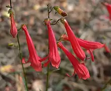 The glandular inflorescence bears tubular red to orange-red flowers 2 to 3 centimeters long. The mouth of the flower has a hooded upper lip and a three-lobed lower lip.