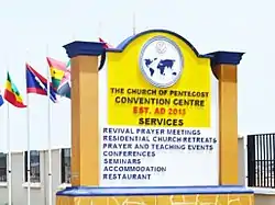 Pentecost Convention Centre (PCC) is located on 250 square acres of land at Gomoa Fetteh in the Central Region of Ghana. Inaugurated in May 2013 with ultra-modern buildings, it is designed to hold conventions for individuals and groups who wish to promote and share common interests. The centre offers sufficient auditoriums, conference centres, accommodation and a floor area to accommodate several thousand attendees. The venue is suitable for major camp meetings, church general meetings and trade exhibition. PCC has four auditoriums with 5,000, 3,000, 500 and 200 seating capacities respectively. It also contains 50 to 100 seating capacity conference rooms, range of executive, standard and economy accommodations and a 3000 seater restaurant.[1]