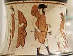 skyphos 06.1079H. 16.2 cm; D. 30.2 cmRed-figure skyphosc.460 BCA & B: A young man goes to warRecord