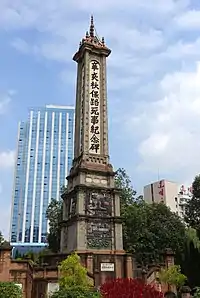 In 1911, the Railway Protection Movement erupted in Sichuan, which led to the Xinhai Revolution that overthrew the Qing dynasty and replaced it with the Republic of China. From 1913–14, the new republican government built the Monument to the Martyrs of the Railway Protection Movement (辛亥秋保路死事纪念碑) in the park, which is now a Major Historical and Cultural Site of China.[1]