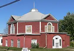 It has been described as perhaps one of the most unusual church buildings in the state, as it has a square, brick first level, about 3 feet (0.91 m) below grade, and a wood-shingled octagonal second level. The second level holds the church meeting hall, approximately 37 feet (11 m) in diameter. As of 1983, it was one of only two octagonal churches in Nebraska (the other being the First Congregational Church at Naponee, in Franklin County, NRHP-listed in 1982, a one-story 1887-built frame structure).[3]
