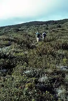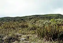 Pēpēʻōpae is located near the summit of Kamakou peak in eastern Molokaʻi at an elevation of about 4,800 feet (1,500 m) at 21°7′8″N 156°53′45″W.[1] Poorly draining acidic soil leaches of nutrients, rainfall that exceeds 300 inches (760 cm), cooler temperatures and high winds have resulted in a bog where the canopy has been reduced to plants that are only inches above the ground. Typical forest canopy trees such as ʻōhiʻa lehua (Metrosideros polymorpha) and ʻōlapa (Cheirodendron trigynum) can be found as groundcover, crawling along the surface.