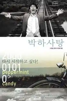 Peppermint Candy (Korean: 박하사탕; RR: Bakha Satang) is a 1999 film, the second from South Korean director Lee Chang-dong. The movie starts with the suicide of the protagonist and uses reverse chronology to depict some of the key events of the past 20 years of his life that led to his death. It was the ninth highest grossing domestic film of 2000 with 311,000 admissions in Seoul.[2]