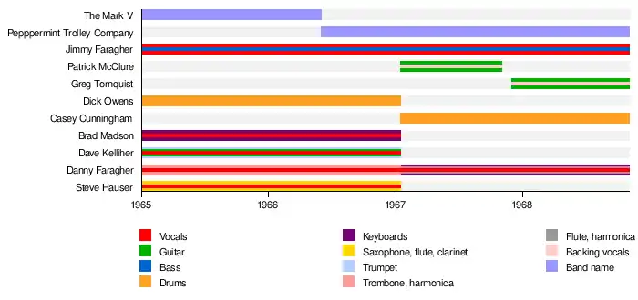 The Peppermint Trolley Company released one album and five singles on the Acta label, a subsidiary of Dot Records. The original line-up included Jimmy Faragher (vocals, bass, guitar), Danny Faragher (vocals, keyboards), Casey Cunningham (drums) and Patrick McClure (guitar, vocals).[2] McClure was later replaced by Greg Tornquist.[3] In 1969, Jimmy and Danny Faragher, Cunningham and Tornquist left their recording contract with Acta to form the rock/soul group, Bones.