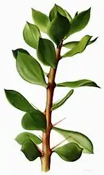 Species of Pereskiopsis do not have the typical appearance of most cacti, including those in the subfamily Opuntioideae to which it belongs, since they have persistent fleshy leaves. They mostly have a shrubby or treelike growth habit, although some scramble or climb. Their stems have a round cross section and are not divided into segments. Their leaves are flat, succulent and generally long-lasting, and of various shapes, including elliptical and almost round. The characteristic areoles of cacti are present, and usually have glochids marking them as members of the Opuntioideae as well as needle-like spines. Their flowers resemble those of the genus Opuntia, with petals that open widely during the day. The fruits, which have few seeds, are fleshy and often have glochids.[1]