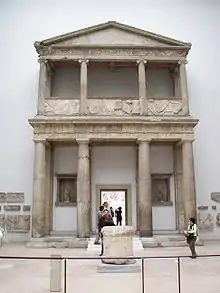 Possibly the most striking example of the reception of this work of art is the Berlin museum which has on view a reconstruction of the altar. The design of the Pergamon Museum was inspired by the gigantic form of the altar.[46] For viewing the altar, indeed for studying this work of art in itself, the reconstruction in the Pergamon Museum came to be important. The partial reconstruction of the edifice does not however reflect what was the main side in antiquity, the eastern wall, but rather the opposite, western side with the stairway. Opinions about this reconstruction, including the installation of the rest of the frieze on the walls surrounding the central exhibition room, were not entirely favorable. Critics spoke of a frieze "turned inside out like a sleeve" and of "theatrics".[47]