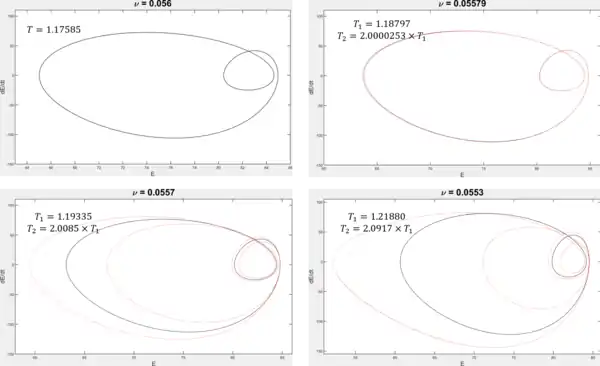 For large values of , evolves toward steady (time-independent) solutions or simple periodic orbits. As is decreased, the dynamics eventually develops chaos. The transition from order to chaos occurs via a cascade of period-doubling bifurcations,[5][6] one of which is illustrated in the figure.