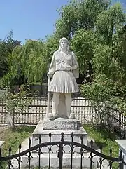 She was born in Siatista, Rumelia Eyalet, Ottoman Empire in 1860.[1][2] Her brother Goulias Krakas was a rebel commander.[1][2] When the 1878 Greek Macedonian rebellion began, she asked to join his forces, which he initially declined.[2] One day, the Ottomans visited her to take her for interrogation, but she managed to escape dressed as a man, and went to find her brother in order to join his forces.[1][2] There, she was initially treated with suspicion by her comrades, but she soon won their respect.[2] The Ottomans managed to kill her brother; either by arresting and flaying him alive, or during a shootout between them and his group.[1][2] Peristera (18 years old at the time)[1] was then proclaimed unanimously as the new commander of the rebel group, which consisted of over 40 men, and became known as "Kapetan Spanovangelis".[1][2] She fought valiantly in the broader region of Kozani and Kastoria for the next six months.[1][2] She also located her brother's killers, and avenged his death.[2] Her actions became known outside Greece, and the French newspaper Le Papillon called her, the Joan of Arc of the 19th century.[2] She stopped her guerrilla activity and returned to Siatista when the Turks granted her amnesty; mediated by the Metropolitan of Sisanion and Siatista Agathangelos, who welcomed her in the church of Saint Demetrios.[1][3] This amnesty was violated by the Turks, and Peristera was forced to leave Macedonia (which was still under Ottoman rule) and take refuge in Thessaly.[1][2] She settled in Ampelonas, where she met with a comrade of hers, named Nikolaos Apostolou (or Perdikas).[1] She married Apostolou in 1882, with whom she eventually had two daughters, named Anneta and Eleni.[1][2] Apostolou was once arrested and imprisoned in Aegina; being accused of robbery.[1][2] Peristera went to Athens and requested to meet with King George I, from whom she asked amnesty for her husband.[1][2] According to tradition, she participated in a shooting match at the Shooting Range of Kaisariani, where she competed with the best shooters and won all of them.[1][2] The King admired her shooting skills, and thus granted the requested amnesty.[1][2] After 8 years of marriage, Apostolou was murdered in 1890.[1] In the Greco-Turkish War of 1897, Peristera's house was burned down by the Turks.[1] Around 1898, Peristera was married for a second time, to someone named Papagianopoulos; with whom she had one son, named Charilaos.[1] Her second husband also died in 1902.[1] Peristera lived the rest of her life in Ampelonas; devoted to raising her children.[1] She died in 1938.[1][2] In 1990, a statue was raised in her honor, at her native town of Siatista.[1]