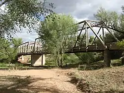 The Perkinsville Bridge over the Verde River was established in 1936 when it was moved from the San Carlos Indian Reservation over the Gila River.[2] The current structure was constructed from spans of the San Carlos Bridge which was built in 1913 and then rebuilt in 1921 after damage due to flooding.[2] It was listed on the National Register of Historic Places in 1989.[1]
