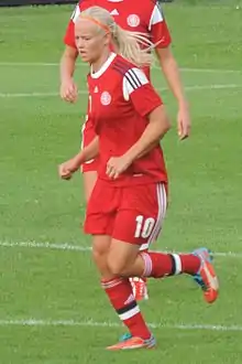 In 2017, she was named in national coach Nils Nielsen's Denmark squad for the UEFA Women's Euro 2017. She captained the team to the final and scored a goal in Denmark's 4–2 defeat by hosts the Netherlands. She was voted runner-up to Lieke Martens in the UEFA Women's Player of the Year Award for 2016–17.[25] On 16 September 2021, she became the record goalscorer of the Danish national team, with her 66 goal in her 129 games.[26]