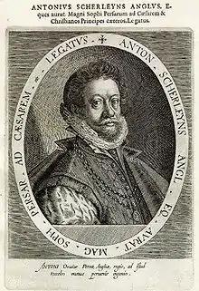 The embassy was composed of one ambassador, Hossein Ali Beg, and four secretaries (First Secretary Uruch Beg, son of Sultan Ali Beg; the nephew of the ambassador 'Ali Quli Beg; and two others) and led by the English adventurer Sir Anthony Shirley.[4][5] Shirley had sailed in from Venice in May 1599 with 25 other Englishmen, and had found favour with King Abbas I.[4] Various contacts had already taken place between the Persians and Europe, as with the embassy of Anthony Jenkinson from Queen Elizabeth I in 1562.[5]