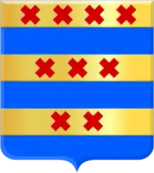 The Persijn Family Coat of Arms is made of six horizontal bars, alternating blue and yellow. On the three yellow (originally gold-colored) bars are respectively 4, 3 and 2, red-colored Saint Andrew's crosses.