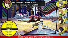 Inside the TV World, the player assembles a party, consisting of the protagonist and up to three other characters, to explore randomly generated dungeons, each tailored around a victim who had been kidnapped. On each floor of a dungeon, the player may find roaming Shadows, as well as treasure chests containing items and equipment. Players progress through the dungeon by finding the stairs somewhere on each floor to progress to the next, eventually reaching the final floor where a boss enemy awaits.[1] The player enters battle upon coming into contact with a Shadow. The player can gain an advantage by attacking the Shadow from behind, whilst being attacked from behind themselves will give the enemy an advantage. Similar to the Press Turn system used in other Shin Megami Tensei games, battles are turn-based with characters fighting enemies using their equipped weapons, items, or the special skills of their Personas. Aside from the protagonist, who is controlled directly, the other characters can either be given direct commands or be assigned 'Tactics' which alter their battle AI. If the protagonist loses all of his HP, the game ends, returning players to the title screen.[1]